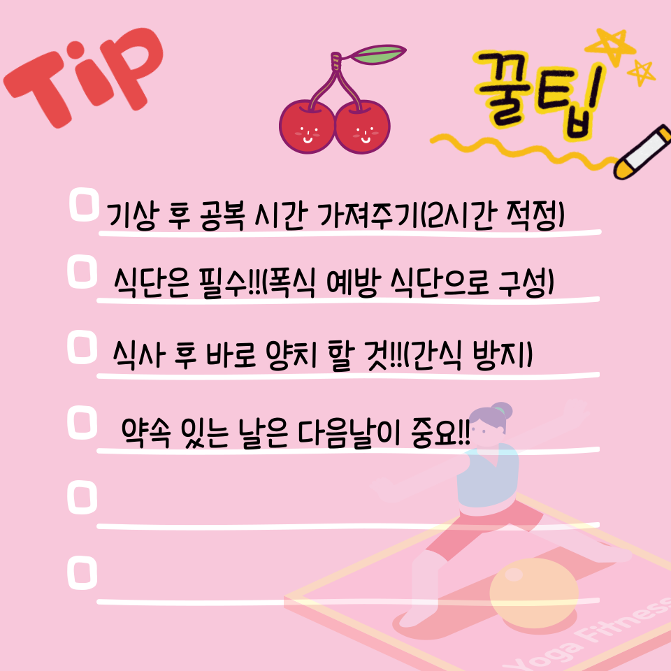 | 10:30~13:00 | 오전 간식 없음, 점심 전 물 750ml 섭취 |