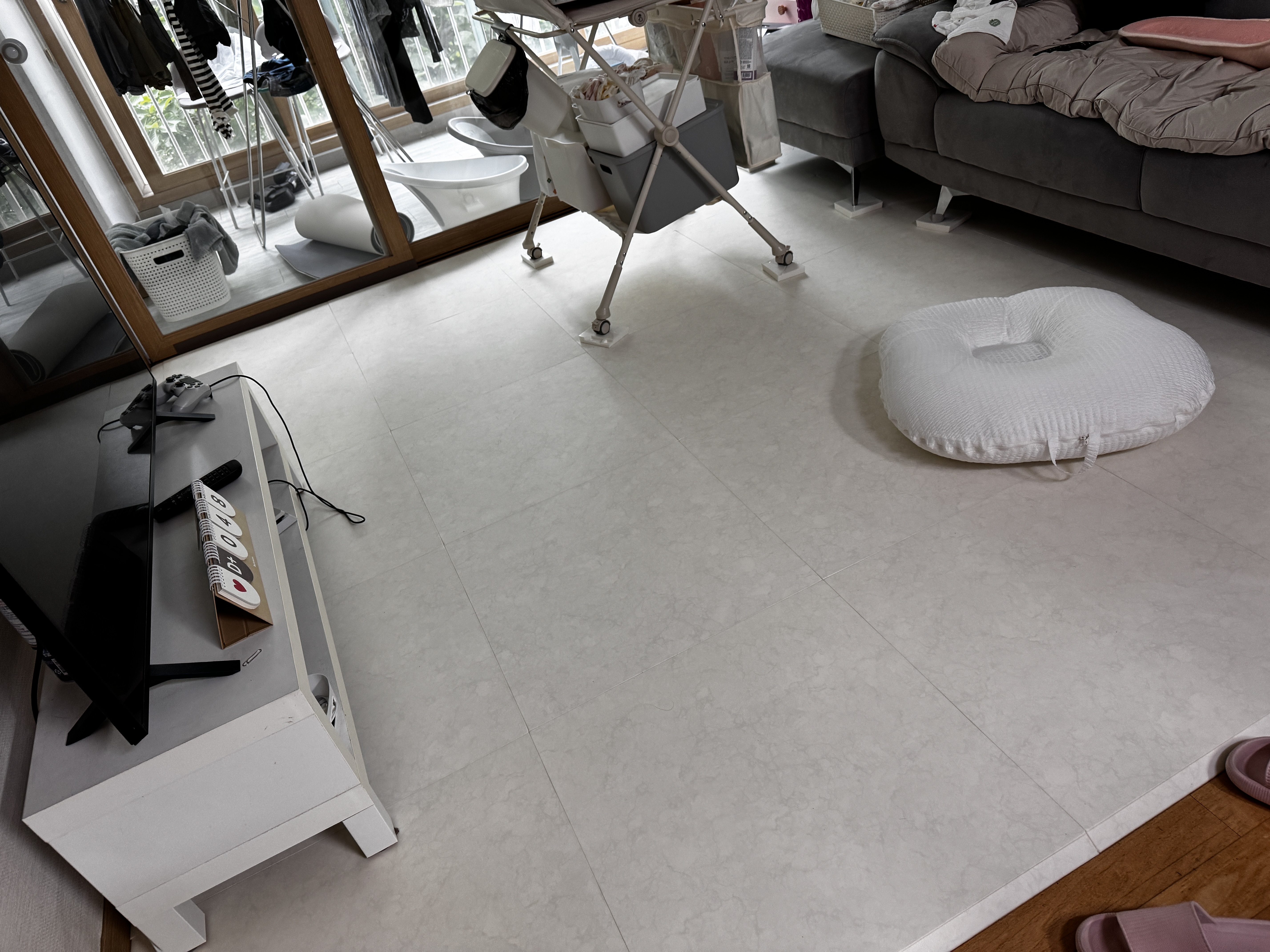 주변에서는 “아기가 기거나 뒤집기 시작할 때쯤 매트를 깔아도 늦지 않다” 는 의견도 있었지만, 저는 신생아 때부터 바닥 생활이 많다는 점 때문에 매트 시공이 필요하다고 판단했어요.